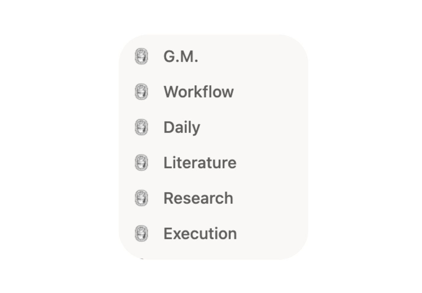 Notice the structure here mirrors an actual workflow: reading (where possible articles begin), then research (where I develop ideas), then execution (where I actually write). I wanted my Notion to reflect a successful creative process where I could move naturally from one stage to the next. “Execution” probably sounds a bit intense, but I genuinely couldn’t think of a better word and it does capture that sense of finally getting the thing done.